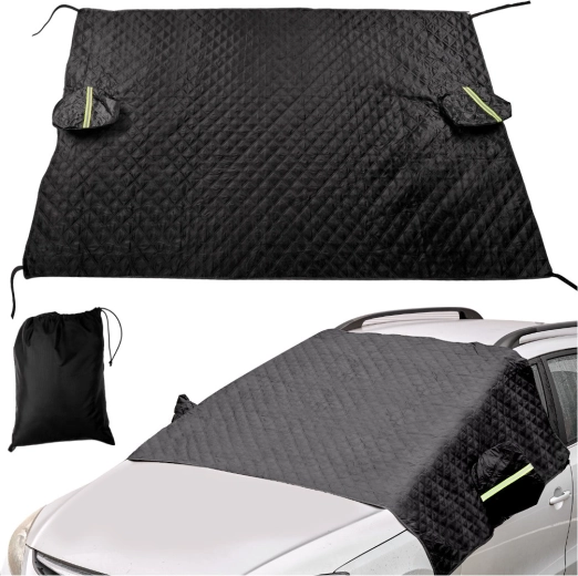 Monteren is zo gebeurd – spreid de hoes over de ruit en zet vast met bevestigingen aan de spiegels en haken aan de wielvelgen. De stabiele bevestiging blijft zitten, ook bij wind. Na gebruik vouw je de hoes eenvoudig op in de praktische opberghoes, die ruimte in de koffer bespaart.