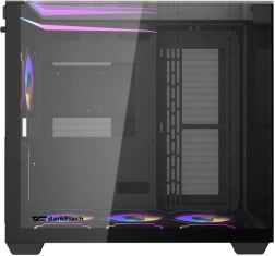 De Darkflash-behuizing is een moderne keuze voor iedereen die kwaliteit en stijl zoekt. Deze computerkast heeft een transparant glazen zijpaneel dat je een blik geeft op zorgvuldig geordende interne componenten. Met RGB-verlichting en meerdere ventilatiemogelijkheden is hij ontworpen voor een sterke esthetische indruk en efficiënte koeling.