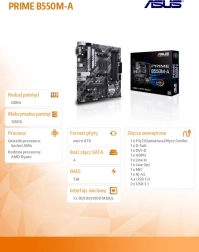 Moederbord ASUS Prime B550M-A is ontworpen voor AMD Ryzen 3e generatie processoren. Het biedt topprestaties met PCIe 4.0, tweezijdige M.2-slots, ondersteuning voor Aura Sync RGB en geavanceerde koelers voor stabiliteit, zelfs bij hoge belasting.