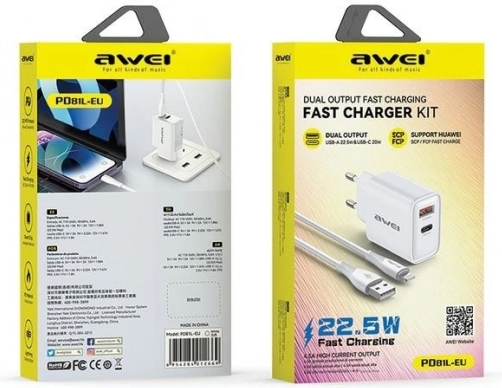 Compacte AWEI‑set: GaN‑lader 22,5 W met USB‑A/USB‑C en 1 m USB‑A/Lightning‑kabel. Snel en veilig opladen met ondersteuning voor QC3.0, FCP, AFC, SCP.