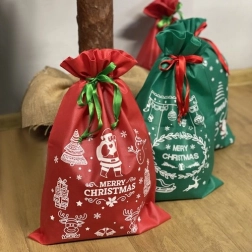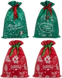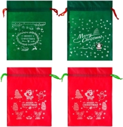 Deze set bevat vier tassen - twee rode en twee groene, elk voorzien van opvallende feestelijke prints, waaronder de Kerstman en sneeuwvlokken. Elke tas is uitgerust met een trekkoord voor eenvoudige en snelle sluiting, wat erg handig is tijdens de drukke feestdagen.