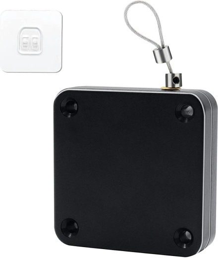 Stevige en compacte deursluiter voor binnendeuren. Zeer eenvoudig te installeren en te bedienen – plak de sluiter op de muur en de speciale hendel op het deurblad, trek vervolgens aan de stalen koord en haak deze aan de hendel. Volledig onderhoudsvrij – er is geen extra energiebron nodig.
