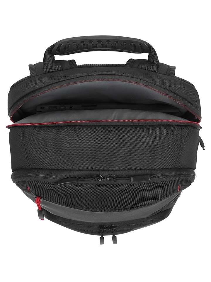 Gewatteerde, verstelbare schouderbanden en een ademend rugpaneel zorgen voor comfort, ook bij langer dragen. De robuuste bovenste handgreep maakt snel meenemen eenvoudig.
