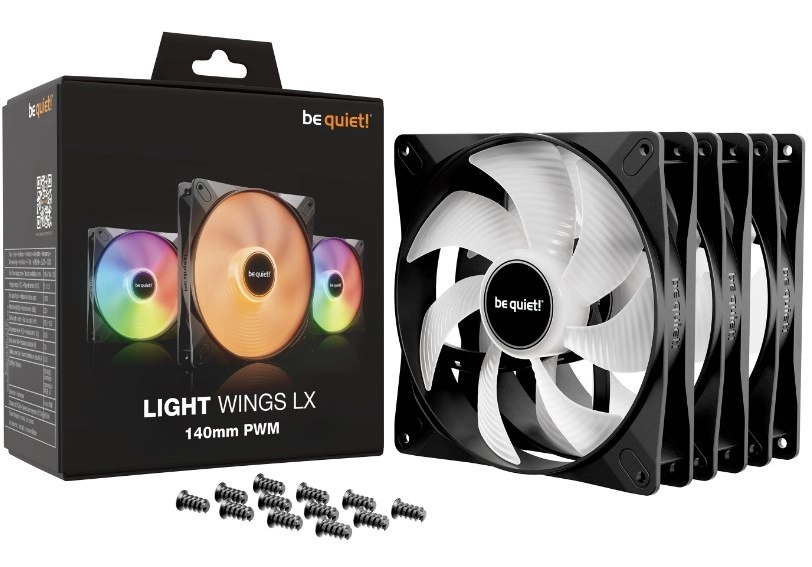 De set van drie be quiet! Light Wings LX 140 mm PWM-ventilatoren combineert uitstekende airflow met indrukwekkende ARGB-verlichting. Dankzij de verlichte rotor met 16 LED’s, geoptimaliseerde bladen en stille werking zijn ze een perfecte keuze voor zowel design- als performance-pc’s.