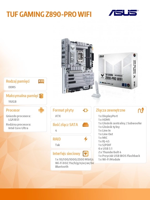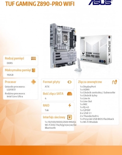 ASUS TUF GAMING Z890-PRO WIFI benut alle kernkwaliteiten van de nieuwste Intel Core Ultra-processors (serie 2) en combineert deze met gameklare functies en beproefde duurzaamheid. Dit moederbord, ontworpen met componenten van militaire kwaliteit, een verbeterde voedingsoplossing en een uitgebreid koelsysteem, overtreft de verwachtingen met robuuste en stabiele prestaties tijdens lange gamingsessies. TUF GAMING-moederborden ondergaan ook strenge duurzaamheidstests om te waarborgen dat ze omstandigheden aankunnen waarin andere mogelijk falen. Dit platform biedt de prestaties en connectiviteit die vereist zijn voor geavanceerde AI-rekenapplicaties.