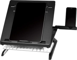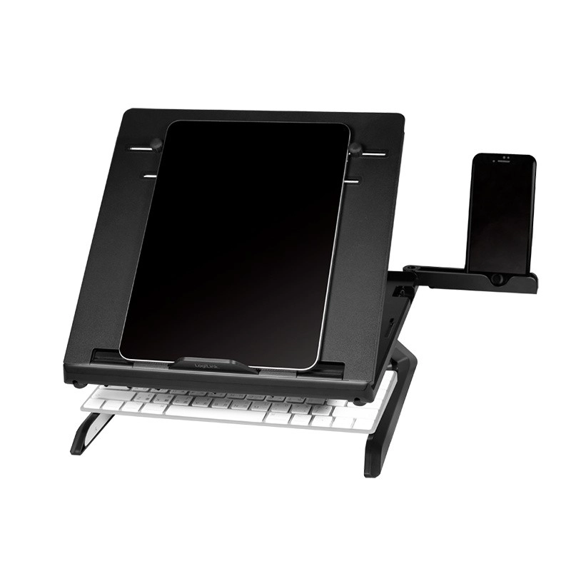 Ergonomische laptopstandaard met houder voor smartphone biedt negen verstelbare posities voor een optimale kijkhoek en een geventileerde constructie voor betere luchtcirculatie.