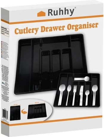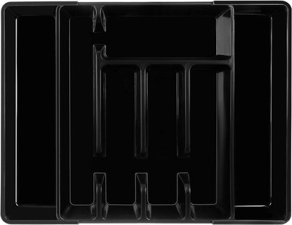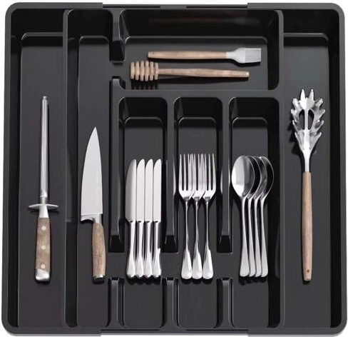 Praktische zwarte ladeorganizer met uitschuifmechanisme past zich eenvoudig aan de breedte van de lade aan en houdt al het bestek en keukengerei op zijn plek. Gemaakt van duurzaam PP, met een glad oppervlak voor eenvoudig schoonmaken en biedt tot 7 overzichtelijke vakken. Ideaal voor universeel gebruik, snelle organisatie en een modern uiterlijk in elke keuken.