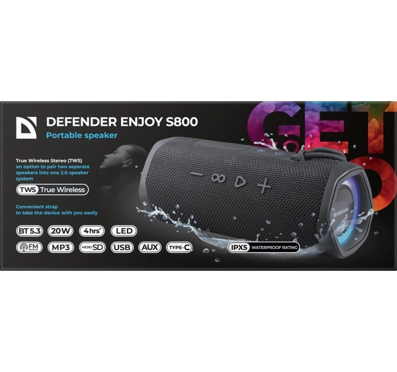 Geniet overal van je favoriete muziek met de DEFENDER Enjoy S800. Deze draagbare luidspreker combineert 20 W vermogen met helder en dynamisch geluid, aangevuld met aantrekkelijke LED-effecten. Dankzij Bluetooth maak je snel verbinding met je telefoon, tablet of laptop en is streamen zo geregeld.