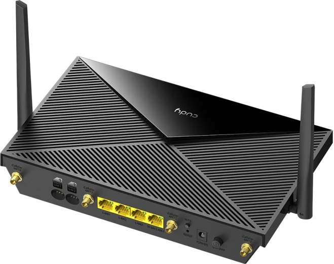 De router is uitgerust met twee sleuven voor Nano‑SIM‑kaarten, met automatische omschakeling voor ononderbroken verbinding. Hij bevat vier gigabit Ethernet‑poorten voor bekabelde connectiviteit en de mogelijkheid om een WAN/LAN‑poort te configureren. Afneembare antennes en ondersteuning voor VPN‑protocollen bieden hoge flexibiliteit en veiligheid.