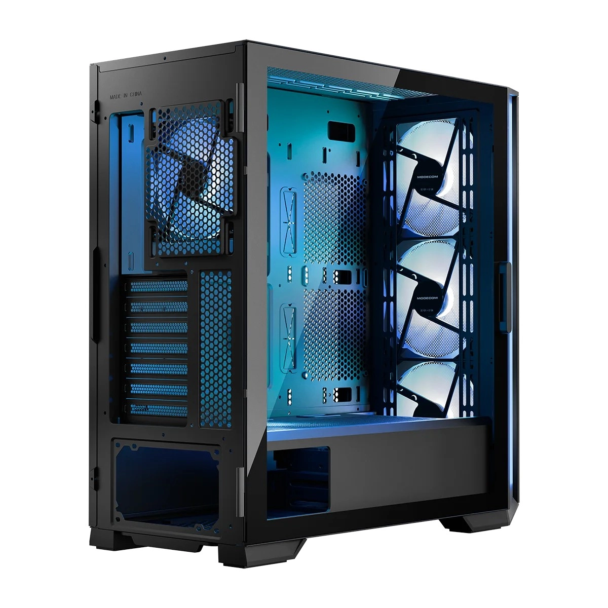 Ontdek de MODECOM Horizon-behuizing, die aan alle eisen voldoet voor een degelijke en functionele computerbehuizing. Het frontpaneel bevat drie 140mm ARGB-ventilatoren voor efficiënte luchtinlaat, terwijl de achterste 120mm ARGB-ventilator warme lucht afvoert.