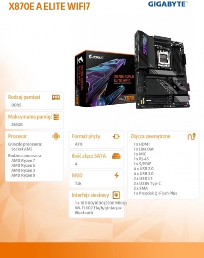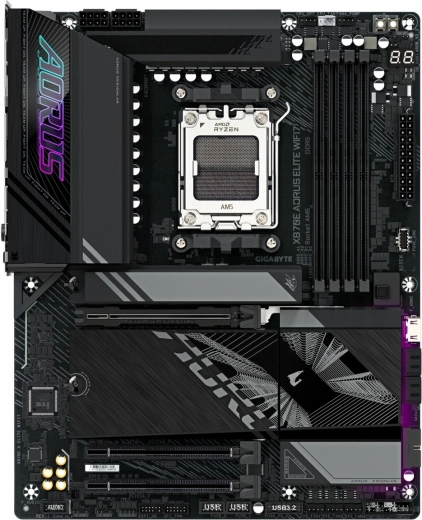 GIGABYTE AORUS X870E A ELITE biedt een toonaangevende basis voor builds met AMD RYZEN 9000/8000/7000‑processors. Dankzij de robuuste 16+2+2‑voedingsfase, de geavanceerde koeling met VRM Thermal Armor Advanced en M.2 Thermal Guard L is het klaar voor hoge kloksnelheden en langdurige belasting. DDR5‑ondersteuning met AMD EXPO‑profielen garandeert maximale doorvoer en lage geheugellatentie.