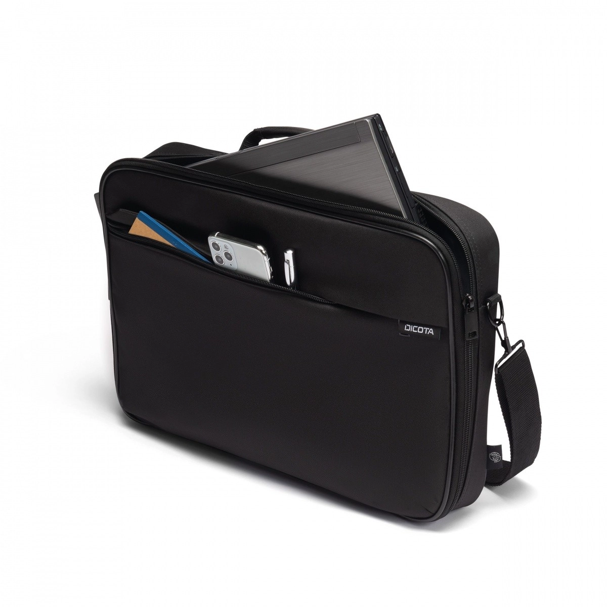 Het voorvak met rits met sleuven voor documenten en mobiele accessoires houdt alles overzichtelijk en snel toegankelijk.