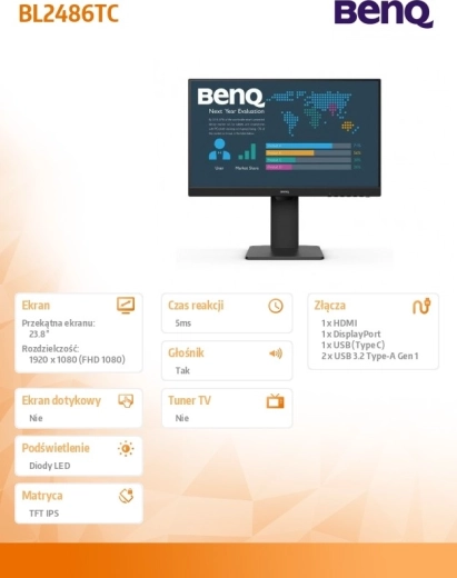 De BenQ BL2486TC is uitgerust met geavanceerde IPS-technologie, die brede kijkhoeken en nauwkeurige kleurweergave garandeert, ideaal voor elke professionele werkomgeving. Met Full HD-resolutie levert hij een scherp en gedetailleerd beeld, onmisbaar voor het werken met grafisch materiaal of documenten.
