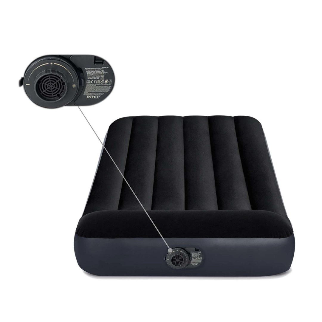 Praktisch opblaasbaar matras van INTEX voor één persoon met afmetingen 191 × 99 × 25 cm, een geïntegreerde elektrische pomp voor snel oppompen en leeglaten, een aangenaam fluweelachtig (velours) oppervlak en een duurzame Fiber-Tech/Dura-Beam-constructie. Ideaal voor thuis en op reis, met een maximale belasting van 136 kg en een gevormd hoofdkussen voor extra comfort.
