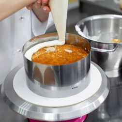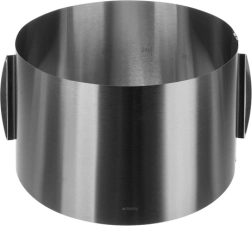 Universele ring van hoogwaardig roestvrij staal, ideaal voor het bakken van bodems, het stapelen van meerdere lagen en voor koude desserts. De extra hoogte van 20 cm biedt voldoende ruimte voor hoge taarten, mousses en cheesecakes. Stevige kliksluitingen houden de gekozen diameter vast en zorgen voor stabiliteit, zelfs bij maximale uitrekking.