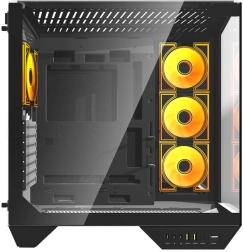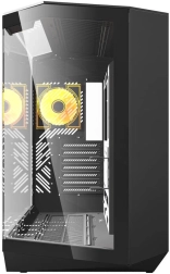 Op het voorpaneel vindt u een breed scala aan connectoren, waaronder USB 3.0 en USB-C poorten, die het gemakkelijk maken om randapparatuur aan te sluiten en snel gegevens uit te wisselen. Gehard glas aan de zijkanten geeft de behuizing een modern uiterlijk en maakt het mogelijk om uw componenten te zien.