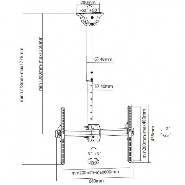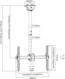 Universele plafondhouder voor televisies LCD/LED 37–70" met een draagvermogen van 50 kg. Robuuste stalen constructie voor veilige montage, VESA-compatibiliteit, kabelbeheer, verstelbare lengte, kantelen en draaien en mogelijkheid tot montage op schuine plafonds.