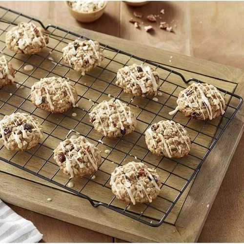 Dankzij het dichte raster is het ook ideaal voor het overgieten met glazuur, chocolade en coatings – het overschot kan vrij weglopen terwijl de desserts stabiel blijven. Het rooster beschermt bovendien het werkblad tegen hitte en maakt schoon en precies werken tijdens het decoreren gemakkelijker.