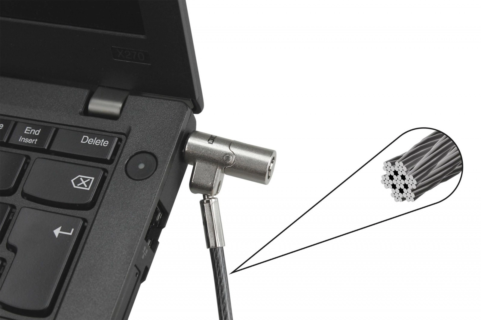 Beveilig je slanke laptop snel en efficiënt. Dit Nano Ultra Slim-slot is compatibel met een 2,5 × 6 mm nanoslot en is ontworpen voor apparaten waarbij de slotkop groter is dan 11 mm. De meeraderige staalkabel met PVC-coating biedt hoge knipbestendigheid, terwijl de rubberen bumper het oppervlak van het apparaat beschermt.