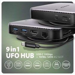Dit compacte 9‑in‑1 dockingstation verandert één USB‑C‑poort van je apparaat in een rijke set aansluitingen. De geïntegreerde externe sleuf voor M.2 NVMe én SATA SSD (2242/2260/2280, M‑key/B+M‑key) maakt van de hub snelle externe opslag met ondersteuning voor TRIM, UASP en uitlezen van S.M.A.R.T.. Een aluminium deksel, meegeleverde passieve koeler en ventilatieopeningen zorgen voor efficiënte warmteafvoer.