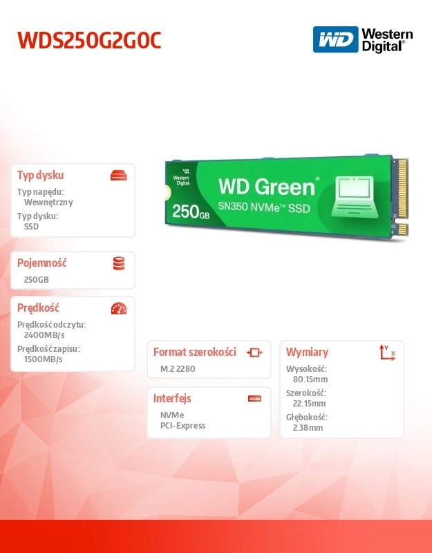 De WD Green SN350 is een betrouwbare oplossing voor dagelijks werk, studie en entertainment. Hij zorgt voor een vlotte systeemprestaties, snelle opstart en het snel laden van apps, en dankzij de NVMe PCIe-interface verkort hij de wachttijden aanzienlijk vergeleken met traditionele SATA-SSD’s. De constructie zonder bewegende onderdelen helpt je gegevens te beschermen tegen schokken en vallen bij normaal gebruik.