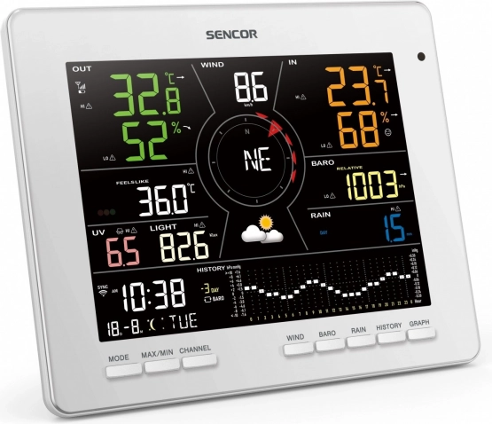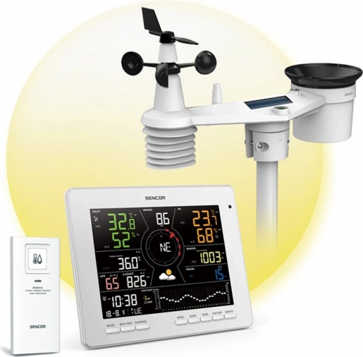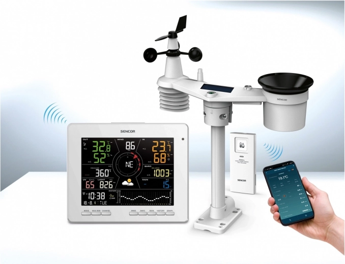 Houd het weer onder controle, thuis en onderweg. Dit professionele Wi‑Fi‑weerstation met 7‑in‑1 sensor en aanvullende TH‑sensor biedt een volledig overzicht van temperatuur, luchtvochtigheid, wind, neerslag, UV en licht, deelt data met Weather Underground en Weathercloud, werkt met SENCOR HOME, Tuya Smart en Smart Life en toont alles overzichtelijk op het grote 7,8" TRUE BLACK LCD met automatische dimfunctie.