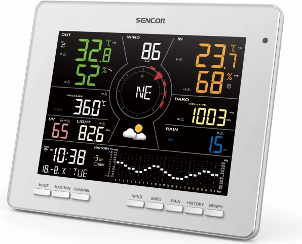 Het grote 7,8" TRUE BLACK LCD met kleurrijke weergave toont niet alleen de binnen- en buitentemperatuur en luchtvochtigheid met comfortindicatie, maar ook luchtdruk, wind, neerslag, UV‑index, lichtintensiteit en duidelijke trendgrafieken. Verder aanwezig: een 12–24 uurs voorspelling op basis van druktrend, tijd, kalender, maanfasen en zonsopkomst/zonsondergang en praktische alarmen voor weersextremen.