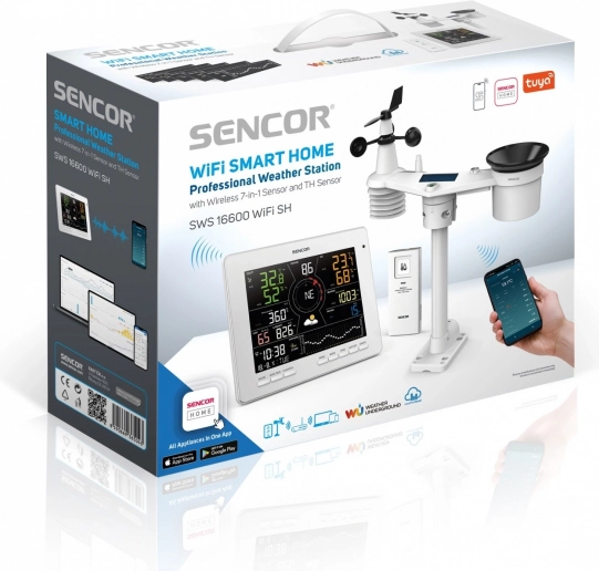Het professionele weerstation met draadloze 7‑in‑1 sensor en TH‑sensor biedt data op het niveau van thuis- en semiprofessionele metingen. Dankzij ondersteuning van de wereldwijde platforms Weather Underground en Weathercloud (plus één eigen) kunt u lokale metingen publiceren en vergelijken met een community van liefhebbers en experts. De mobiele app Sencor HOME (Android/iOS) zorgt voor online toegang tot live- en historische data en koppeling met de smart home.
