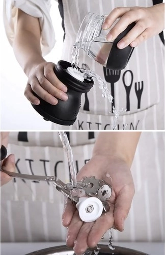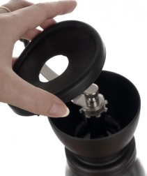 De praktische uitrusting omvat 2 glazen reservoirs van 120 g met deksels om de versheid te bewaren, een metalen zwengel voor soepel malen en een antislip siliconen basis voor stabiliteit op het aanrecht. Glazen onderdelen zijn vaatwasmachinebestendig; de rest reinig je eenvoudig met de hand.
