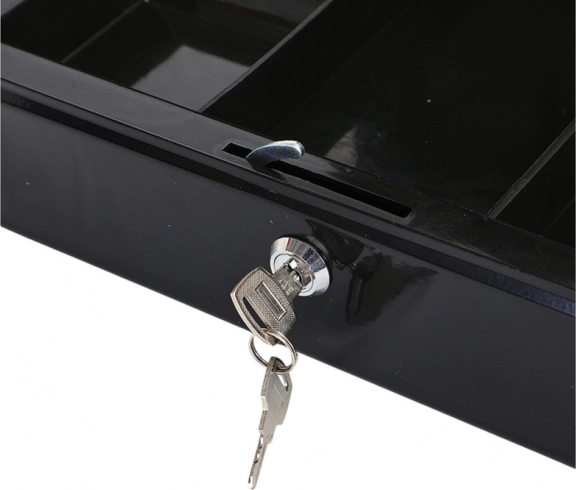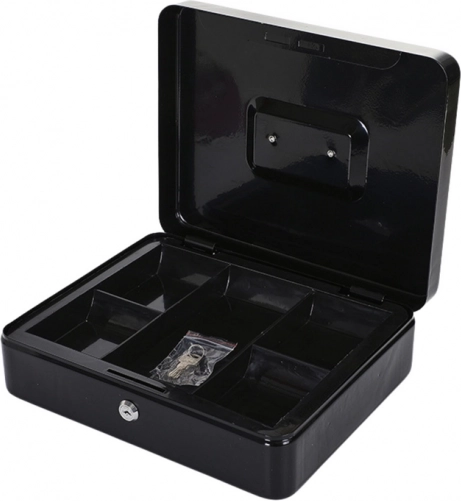 Dubbelwandige metalen geldkist met vakverdeling en twee sleutels zwart