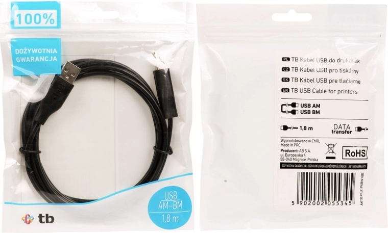 Universele zwarte USB-kabel AM-BM met een lengte van 1,8 m, ideaal voor het aansluiten van een printer of scanner. Biedt een eenvoudige en snelle uitbreiding van uw apparaat.