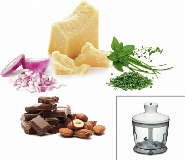 De universele hakmolen hakt in een mum van tijd kruiden, noten of Parmezaan. Geselecteerde accessoires zijn vaatwasmachinebestendig voor eenvoudig onderhoud.