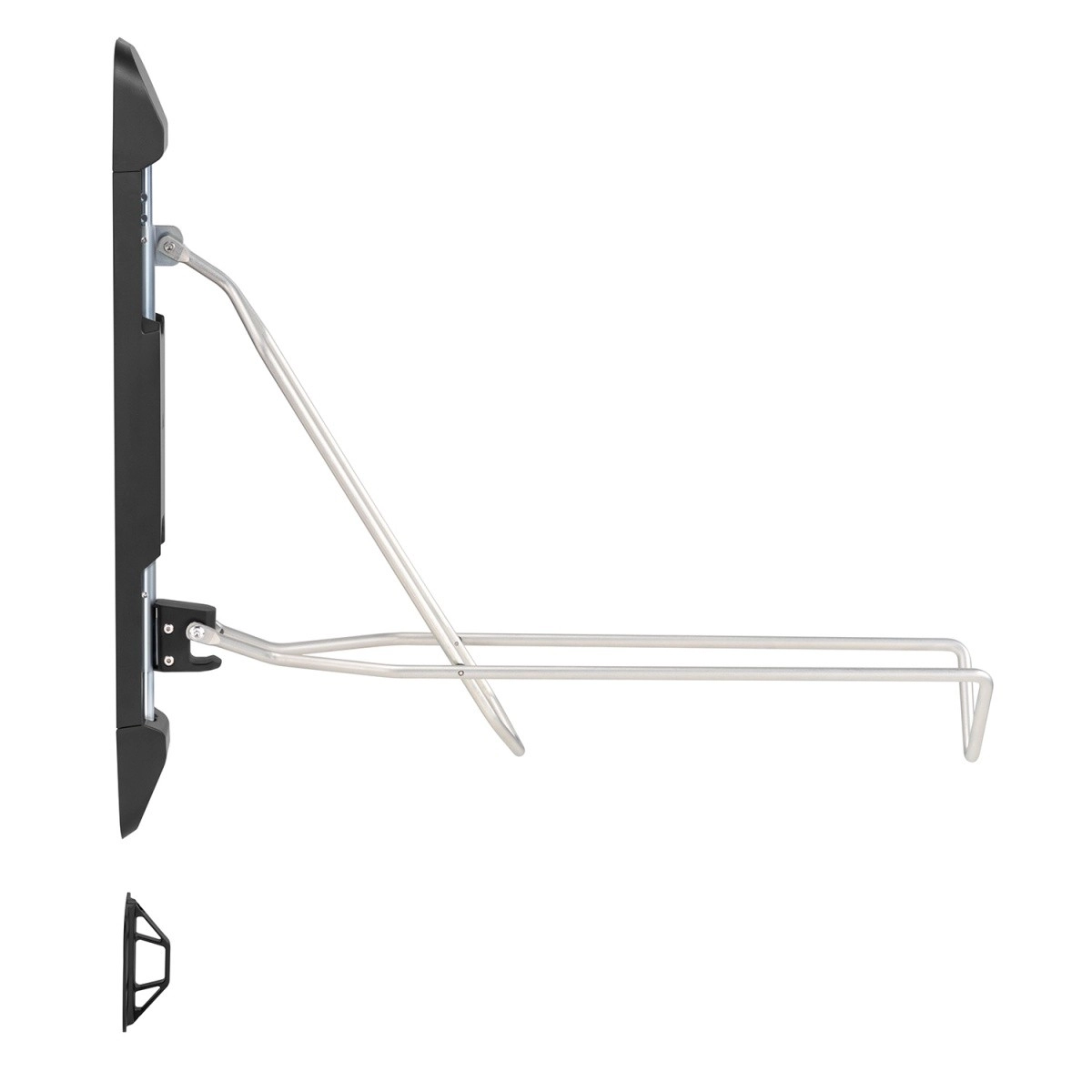 De houder zorgt voor stabiliteit en veiligheid en houdt de fiets in verticale positie. Dankzij de vijf verstelbare hoogteniveaus past hij zich aan verschillende fietsformaten aan. Nadat de fiets is verwijderd, kunt u de houder inklappen om nog meer ruimte te besparen.