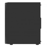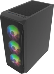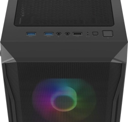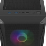 Het I/O‑paneel bovenaan biedt alles wat je nodig hebt: 2× USB 3.0, 1× USB 2.0, HD‑audio 3,5 mm voor hoofdtelefoon en microfoon, knoppen Power/Reset en status‑LED’s. Gehard glas aan het linker zijpaneel benadrukt je componenten en RGB‑effecten, terwijl dichte stoffilters het interieur langdurig schoon houden.