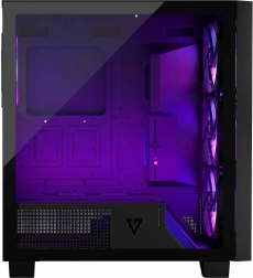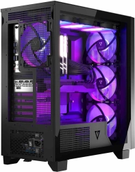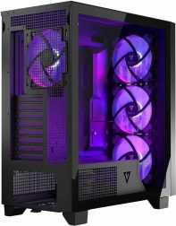 VOLCANO Perun Apex ARGB is een elegante midi-tower met mesh front en een zijpaneel van gehard glas, die uitstekende luchtstroom, 4× 140mm ARGB-ventilatoren met controller, E-ATX-ondersteuning en USB‑C op het bovenpaneel biedt. Dankzij stoffilters, snelkoppeling-zijpanelen en een GPU-steun bouw je eenvoudig een krachtige en nette gaming-pc.