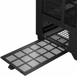 Beide zijpanelen verwijder je gereedschapsloos. Het schuifbare onderdeel met in hoogte verstelbare GPU-steun en rubberen doorvoeren verbergen kabels en verbeteren de luchtstroom.