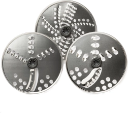 De set van drie dubbelzijdige roestvrijstalen schijven biedt verschillende groftes voor raspen en snijden. Geschikt voor groenten, kaas en noten en zorgt voor gelijkmatige resultaten.