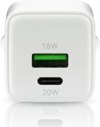 De oplader biedt snel opladen via de dubbele USB-A- en USB-C-poort.
