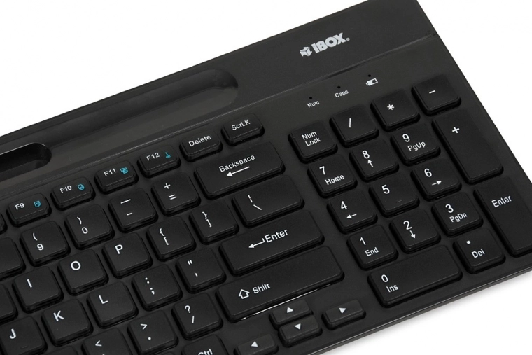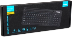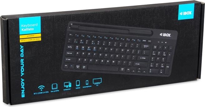 Het draadloze toetsenbord iBOX Kallisto biedt een multifunctionele oplossing voor uw apparaten. Het ondersteunt zowel 2,4 GHz draadloze USB als Bluetooth, waardoor het een universele keuze is voor computers en mobiele apparaten. Een speciale uitsparing maakt het gemakkelijk om een mobiel apparaat voor de gebruiker te plaatsen en de functie om tussen gekoppelde apparaten te schakelen vereenvoudigt werken in uiteenlopende omgevingen.