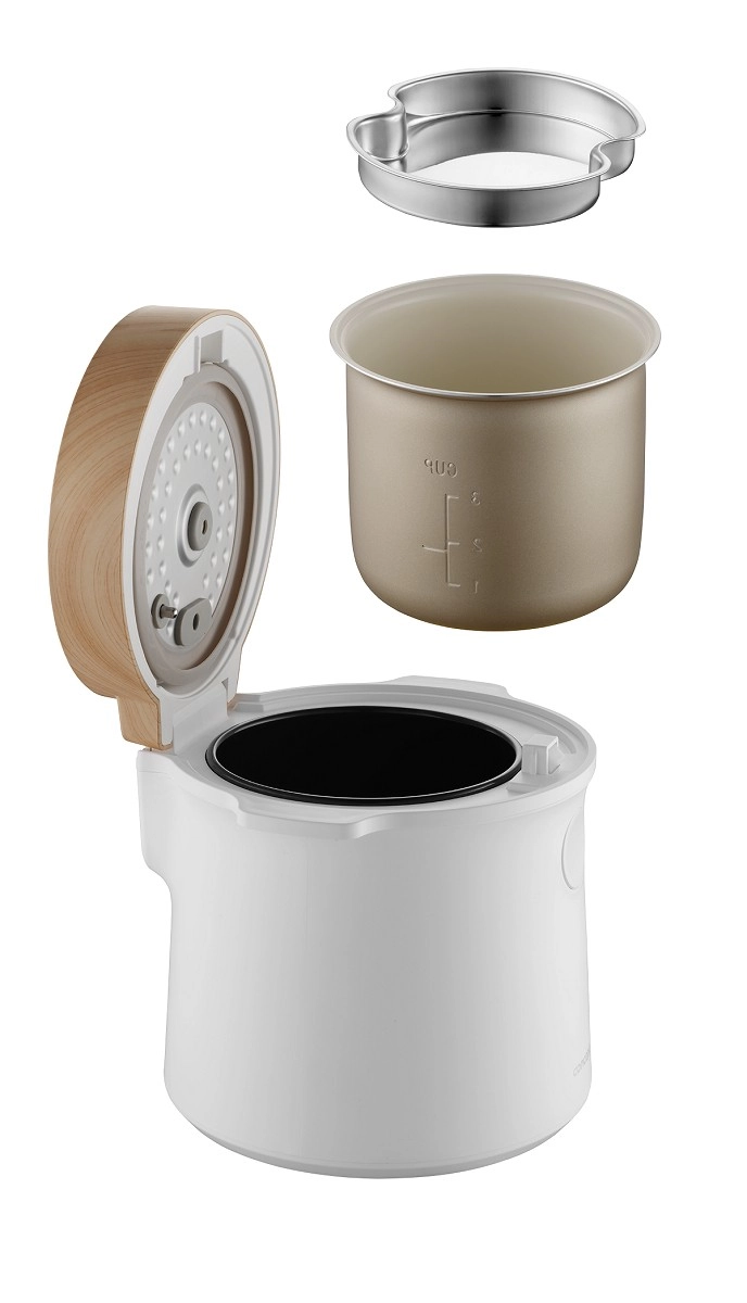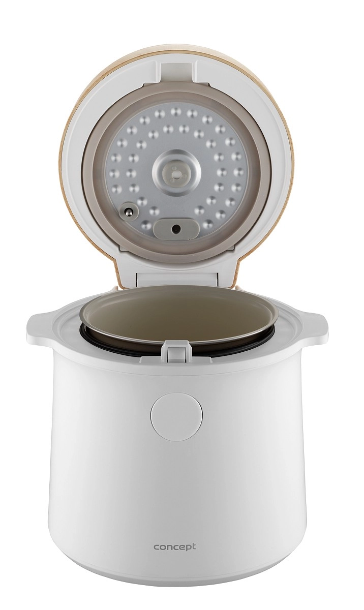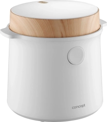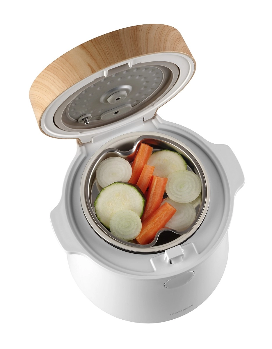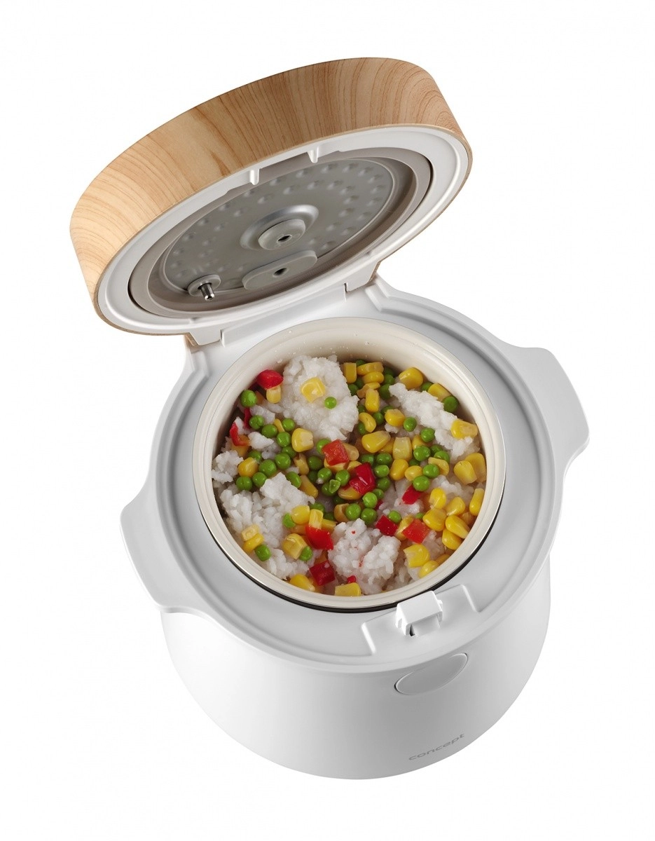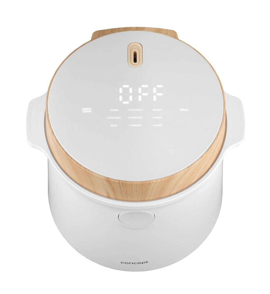 De multifunctionele rijstkoker Concept RE3030 met 9 programma’s maakt het dagelijks koken eenvoudiger. Hij blinkt uit in het koken van rijst, stomen, snelkoken, warmhouden en bereidt ook quinoa, soepen, havermoutpap en huisgemaakte yoghurt. Dankzij de Keep Warm-functie blijft het gerecht warm tot het serveren en het compacte, elegante design in wit met houtaccent past perfect in elke keuken.