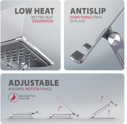 Geniet van een comfortabele werkomgeving met een compacte en draagbare standaard die aan uw behoeften voldoet, of u nu thuis, op kantoor of onderweg werkt. Deze standaard is gemaakt van duurzame aluminium gietstukken die zorgen voor langdurige betrouwbaarheid en duurzaamheid. Dankzij het antislipoppervlak hoeft u zich geen zorgen te maken over ongewenste bewegingen; uw apparaat blijft stevig op zijn plaats zonder het oppervlak van de laptop of de ondergrond te beschadigen.