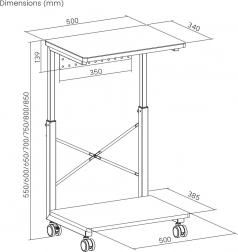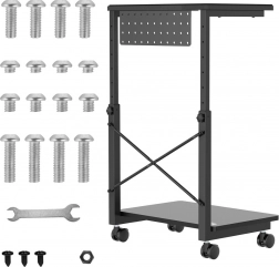 Deze verrijdbare standaard is ideaal voor wie vaak de positie van de computer moet veranderen of beperkte werkruimte heeft. Met de mogelijkheid om de hoogte van 550 tot 850 mm in te stellen, kan hij worden aangepast aan verschillende soorten bureaus en werkplekken, wat de flexibiliteit aanzienlijk vergroot. Bovendien biedt de praktische plank ruimte voor het opbergen van accessoires of kan dienen als ondergrond voor een laptop.