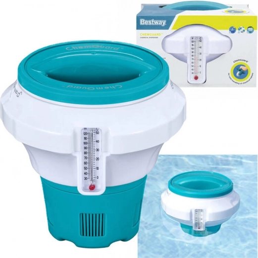 De BESTWAY chemiedispenser is een praktische en onmisbare hulp voor elke zwembadbezitter. Deze drijvende dispenser zorgt voor een efficiënte verdeling van chemicaliën en helpt de reinheid en waterkwaliteit te behouden. Deze dispenser is ideaal om het water schoon te houden en de temperatuur eenvoudig te meten. Dankzij de ingebouwde handschoen is het veilig en eenvoudig omgaan met chemicaliën mogelijk, en met de regelknop kun je nauwkeurig doseren. Technische parameters: