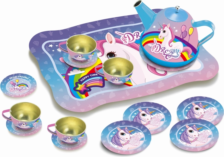 Magische theeset in een schattig koffertje met eenhoorn-motief, een feest voor elke kleine gastvrouw. Bevat een theepot, 4 kopjes, 4 schoteltjes en 4 bordjes, allemaal van duurzaam metaal. Het praktische koffertje met handvat heeft afmetingen van 25 × 19 × 10 cm – ideaal voor op reis en om op te bergen.