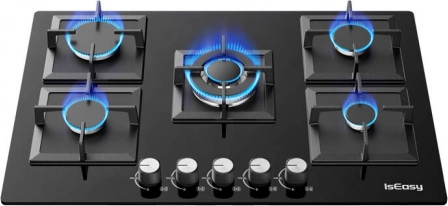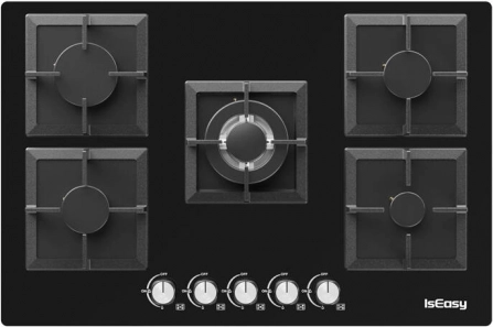 Het IsEasy glazen gasfornuis brengt een modern design en hoge efficiëntie naar uw keuken. Het is uitgerust met vijf branders met verschillende vermogens: 1x 1 kW, 2x 1,75 kW, 1x 2,7 kW en 1x 3,3 kW, waardoor u meerdere gerechten tegelijk kunt bereiden.