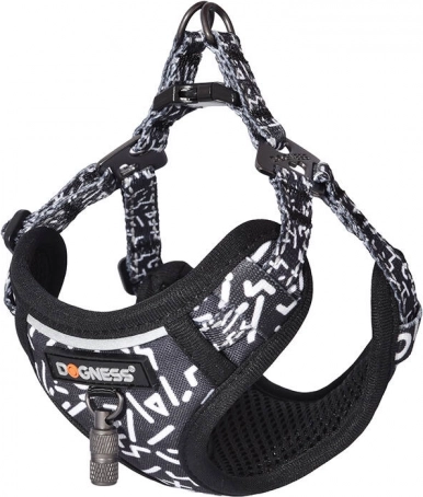 De stijlvolle zwart-witte Dogness-set combineert een lijn van 1,5 m met een comfortabel harnas voor dagelijkse wandelingen. Dankzij de combinatie van duurzaam nylon, ademend mesh en stevige metalen onderdelen van zinklegering biedt het maximaal comfort en veiligheid voor jou en je hond.