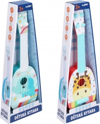 Deze kindergitaar met Afrikaanse dierenmotieven is ideaal voor jonge beginners. Het heeft vier kunststof snaren en een lengte van 37 cm, wat het een perfecte keuze maakt voor makkelijk vasthouden en spelen.