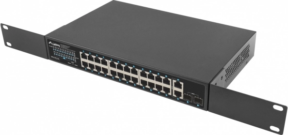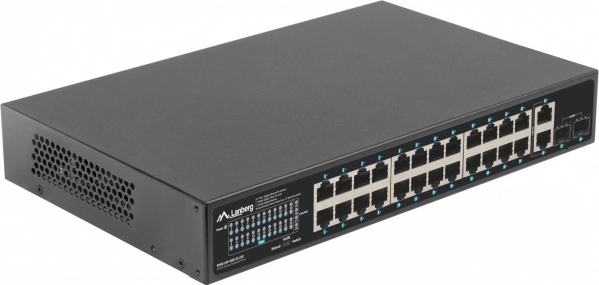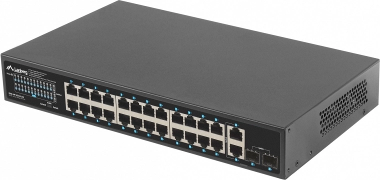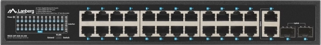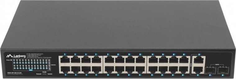 Betrouwbare LANBERG-switch met 24x Gigabit PoE+, 2x Gigabit-uplink en 2x SFP, biedt een werkelijk PoE-budget van 250 W, uitgebreide reikwijdte tot 250 m in EXTEND-modus en 4 kV overspanningsbeveiliging – ideaal voor camerasystemen, IP/VoIP en bedrijfsnetwerken.