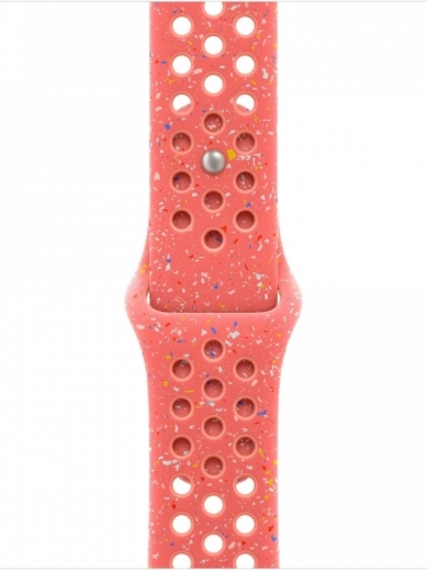 Speciaal gegoten ventilatiegaten verhogen de luchtcirculatie, minimaliseren zweten en houden je pols droog. Willekeurig verspreide gekleurde “vlokjes” creëren een uniek patroon – elke band is anders. De aluminium sluiting met drukknoop en lus in een elegante matte afwerking zorgt voor snelle en veilige bevestiging.