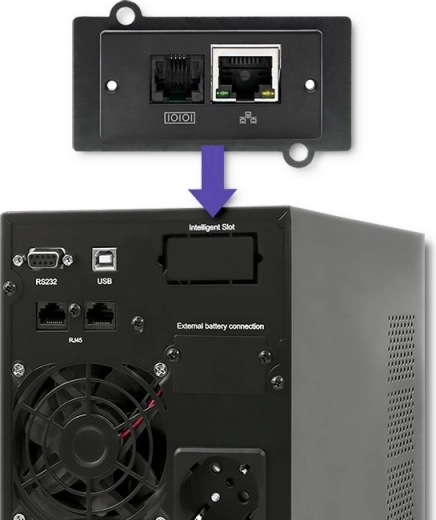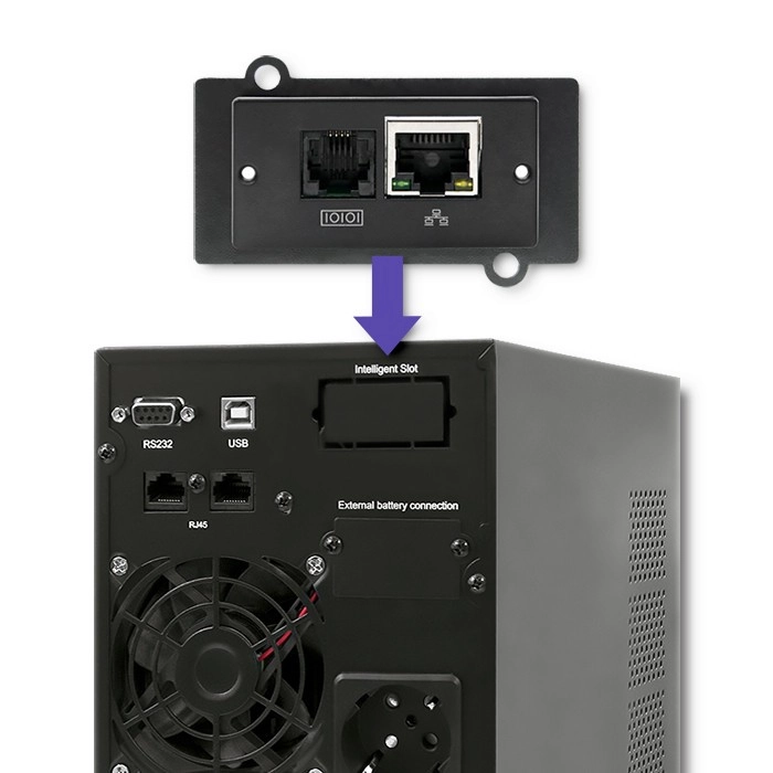 - Mogelijkheid tot aansluiting van een SNMP-kaart of adapter voor netwerkbeheer.